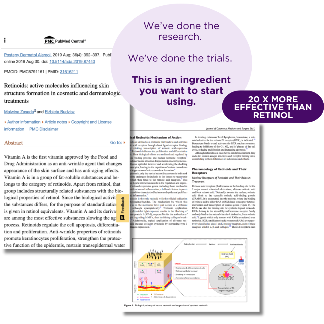 Retinal (Retinaldehyde) is a more advanced form of Vitamin A than retinol. Retinal is 20 x more effective and the least irritating form of Vitamin A. Unlike retinol, which must first convert into Retinal before becoming active, Retinal is already one step closer to being in its most effective form for the skin.