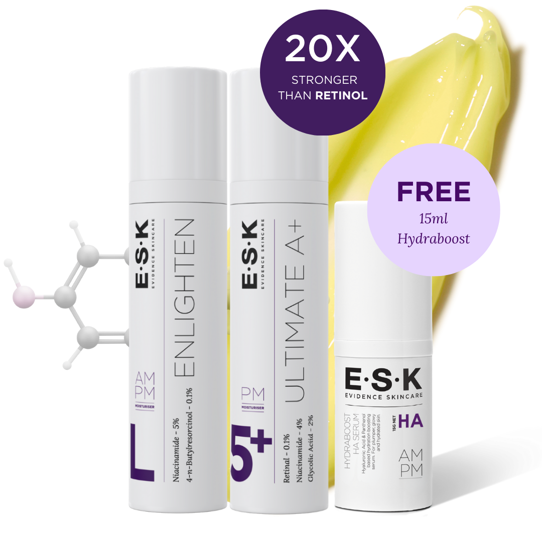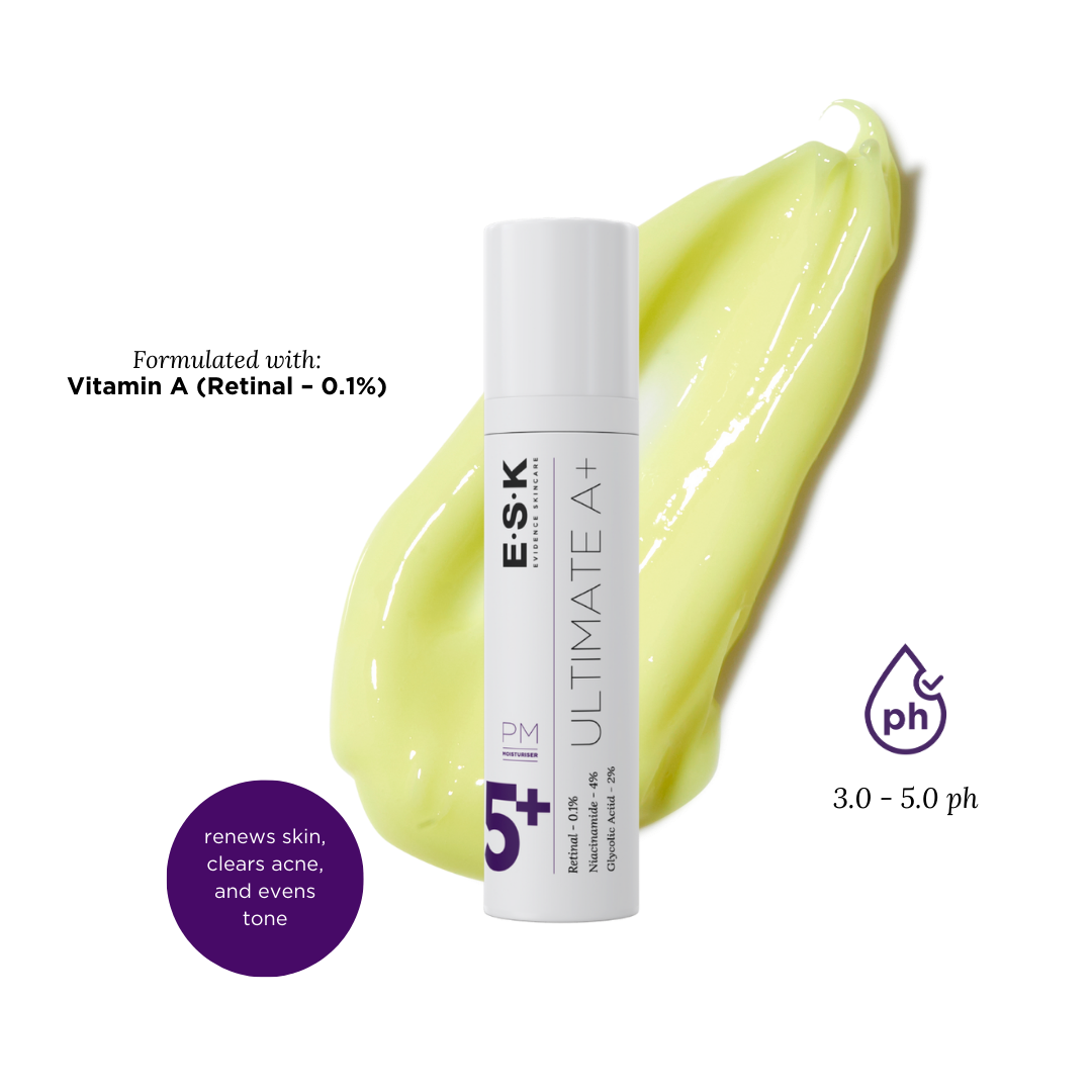 Ultimate A+ (active night cream): With Retinal, the most effective and least irritating form of Vitamin A. A night cream that boosts collagen and visibly reduces fine lines and wrinkles.