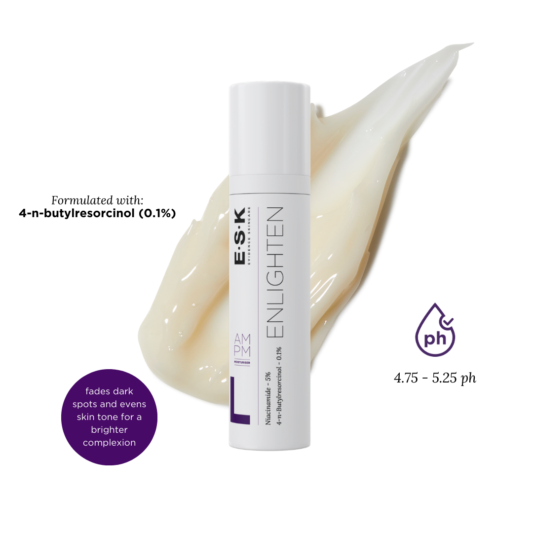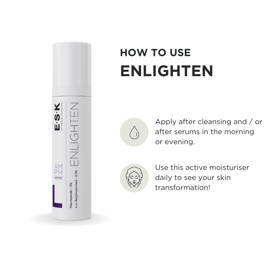 Our Enlighten is an 'active ingredient' moisturiser. It is a tyrosinase inhibitor (4-n-butylresorcinol – 0.1%) and an antioxidant (Niacinamide – 5%) based cream to lighten and brighten skin appearance and provide a more even skin tone.