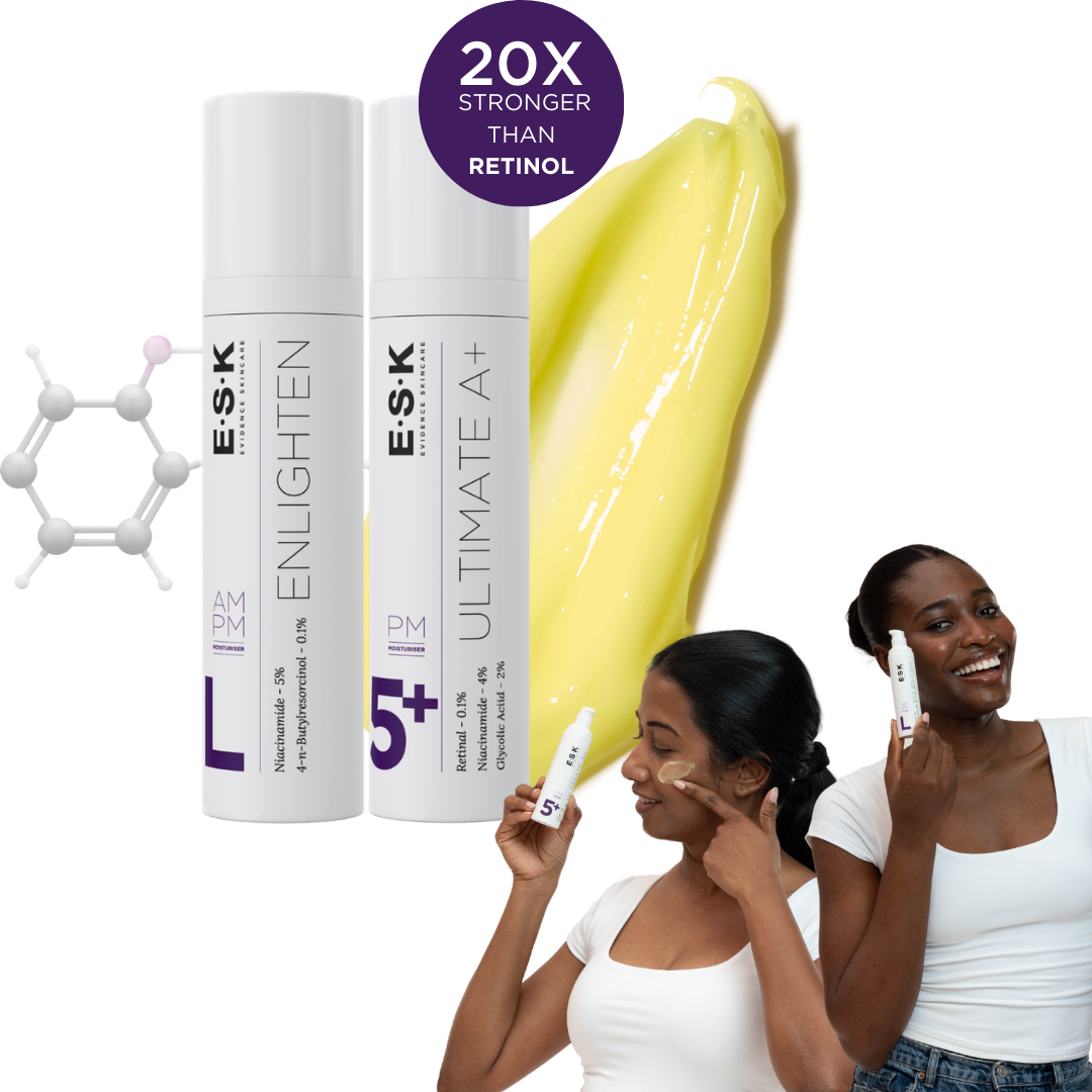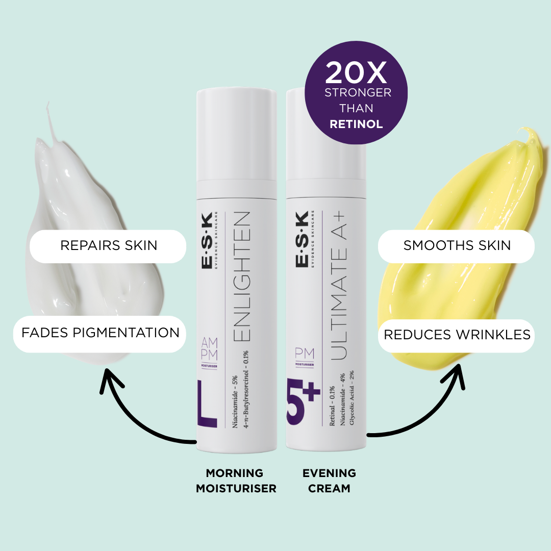 Our 0.1% Retinal Night Cream, paired with our innovative Pigmentation Morning Cream offers a cutting-edge approach to anti-aging. This powerful combination works to: